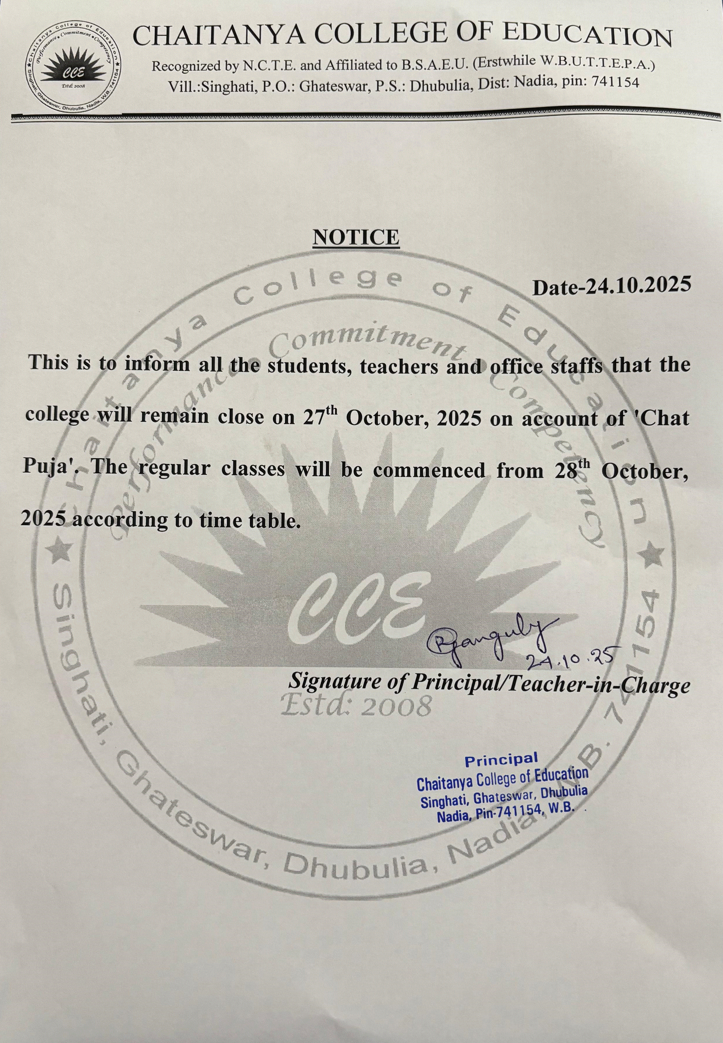 Details:College will remain close on 27th October, 2025 on account of 'Chat Puja'