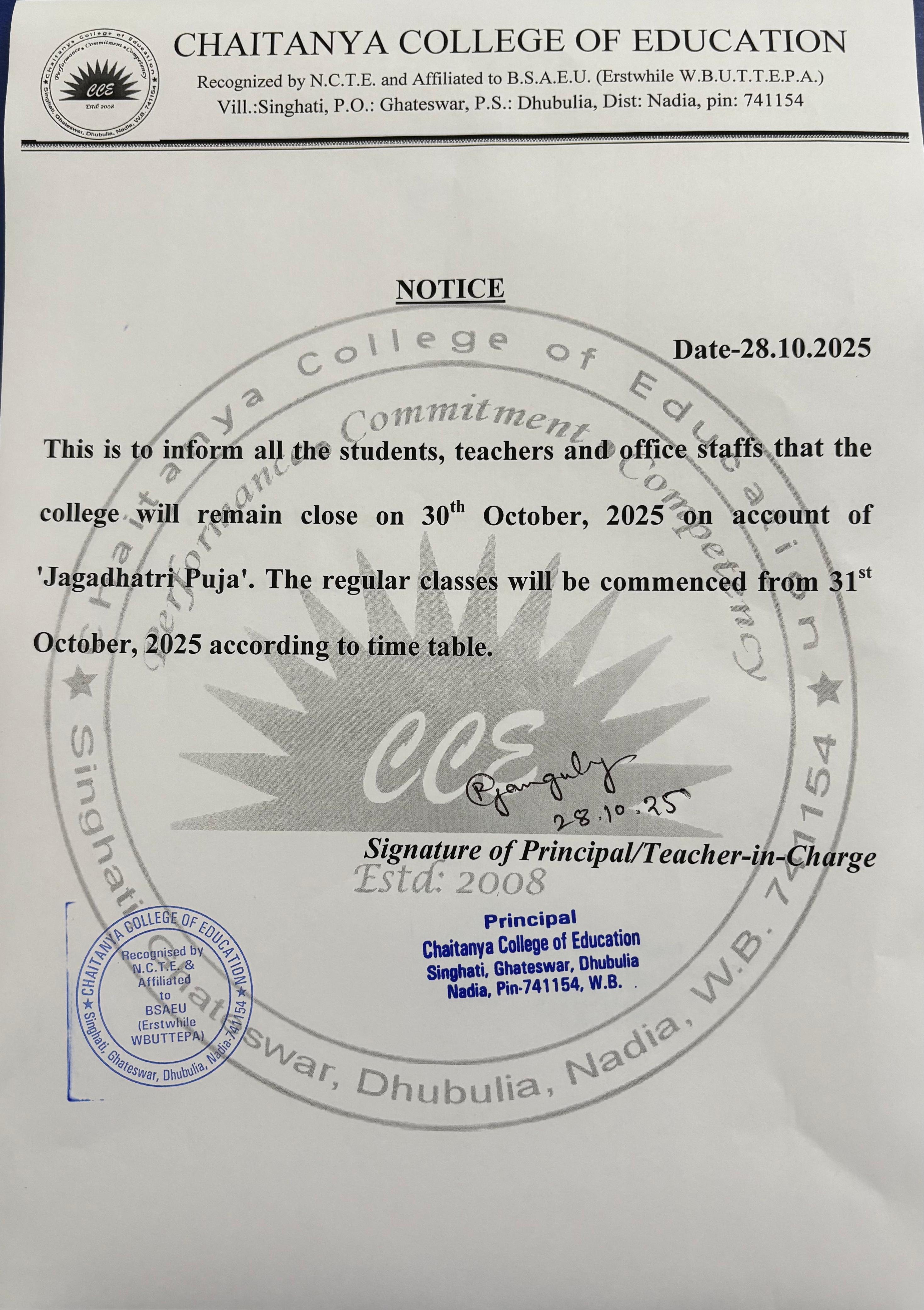 Details:College will remain close on 30th October, 2025 on account of ‘Jagadhatri Puja’